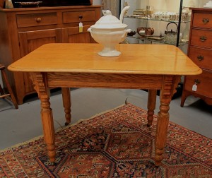 Antique Oak Kitchen Table (SOLD); Redcliff Ironstone Soup Tureen with Ladle $55 ~ Dealer 22