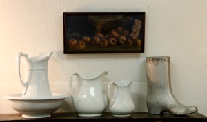 Antique Ironstone Pitcher & Bowl (SOLD); Medium Ironstone Pitcher (SOLD); Small Ironstone Pitcher (SOLD); Metal Boot Form (SOLD) ; Apple Print (SOLD) ~ Dealer 617