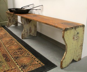 Early Six Foot Bucket Bench & Selection of Large Iron Skillets (SOLD)