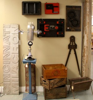 Industrial Sign $95; Van De Graaff Trilectrodynamic Illuminator by Ron Lis $365; Selection of Foundry Molds $24-$42; Antique Advertising Crates $49 each; Funky Industrial Magazine Rack $68 ~ Vignette Booth