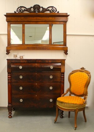 Period Beidermeier Over-Mantel Fruitwood Mirror $675; Empire Flame Mahogany Chest with Glass Knobs, ca. 1880 (SOLD); Antique Carved Rosewood Chair $165 ~ Dealer 22