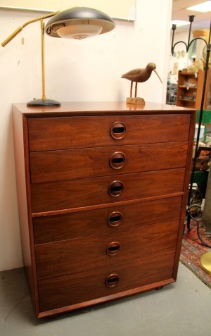 Mid-Century Modern Six-Drawer Walnut Chest (SOLD); Mid-Century Desk Lamp $85; Carved Shore Bird $59 ~ Dealer 22