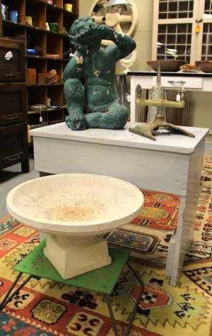 Deco Birdbath (SOLD); Vintage Pan Garden Fountain (SOLD)