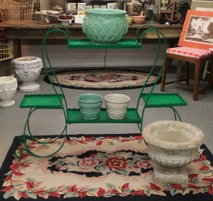 Large Curvaceous Iron Plant Stand (SOLD), McCoy Jardiniere (SOLD), Concrete Garden Urn $55; McCoy Flower Pots $22 each ~ Dealer 617