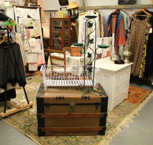 Antique Flat Top Trunk (SOLD); White Metal Planter (SOLD); Green Metal Plant Stand $39 ~ Dealer 1710