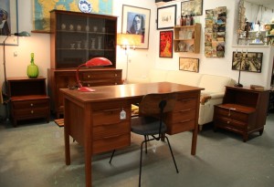 Pair of 1960’s Willett Solid Cherry End Tables (SOLD); Willett Solid Cherry Sideboard China Cabinet (SOLD); Modern 1960s Sofa (SOLD); Danish Modern Desk (SOLD) ~ Dealer 15