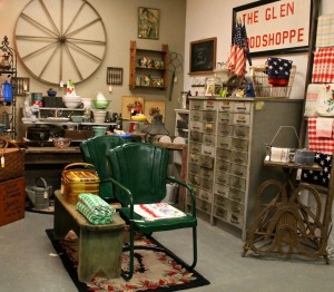 Antique Primitive Bucket Bench with Old Green Paint (SOLD); Tin Picnic Basket $23; Vintage Parade Flags $7.50 each ~ Dealer 617