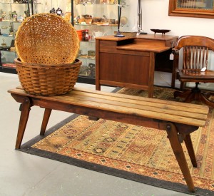 Antique Folding Bucket Bench (SOLD); Antique Split Oak Basket $95; Split Reed Basket $39 ~ Dealer 77