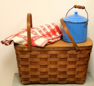 Fourth of July Picnic Kit – Split Oak Picnic Basket $35; Vintage Red & White Picnic Cloth $25; Antique Blue Enamelware Berry Bucket $46 ~ Dealer 617
