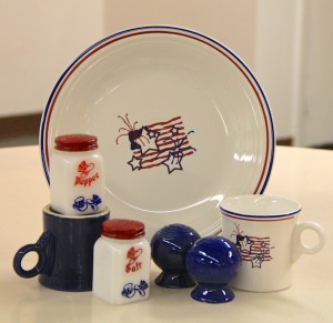 Post-86 July 4th Fiesta Plate ($15) and Tom & Jerry Mug ($12); Vintage Fiesta Cobalt Shakers $29; Milk Glass Shakers ($20); Vintage Fiesta Tom & Jerry Mug in Cobalt ($65) ~ Dealer 4