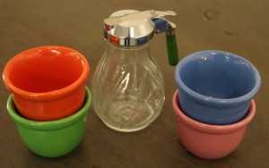 Four Colorful Vintage Custard Cups (SOLD); Syrup Pitcher with Green Bakelite Handle $20 ~ Dealer 4