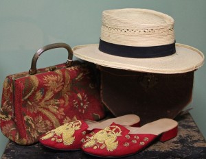 Dealer 2 ~ Vintage Carpet Bag $65; Enchanted Gold Embroidered Slippers $42; Straw Hat $30