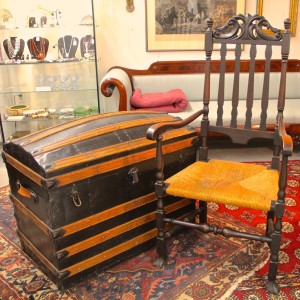 Dome Top Trunk & Elegant Carved Chair with Rush Seat (SOLD)