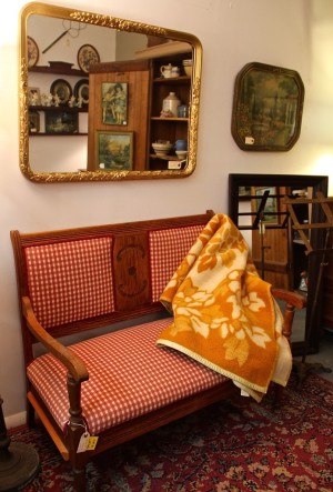 Dealer 617 ~ Pretty Carved Mirror (SOLD); Vintage Wool Lap Blanket $48; Oak Settee $95