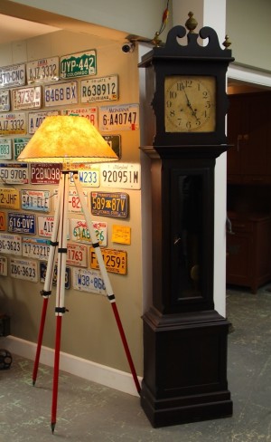 Surveyor’s Red & White Tripod Lamp with 50s Fiberglass Shade $195; Ithaca Calendar Clock Company Grandfather Clock $1650