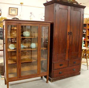 Antique Oak China Cabinet with Old Glass (ca. 1920) (SOLD) & Antique 2-Door Cupboard with 3 Drawers (SOLD)