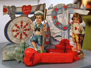 Antique Paper Valentines $12 & $16 each (Dealer 97); Vintage Valentine PEZ Dispenser (Dealer 4)