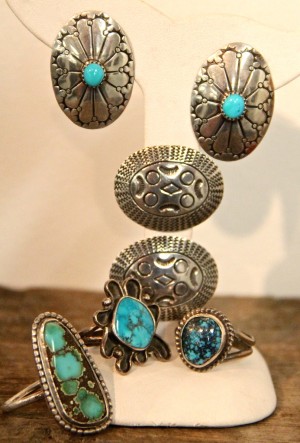 Sterling & Turquoise Jewelry – Earrings $35 per pair (Dealer 97), Rings L to R Turquoise & Agate, Signed $54 (Dealer 84), Sterling & Turquoise $42.50 and $45 (Dealer 320)