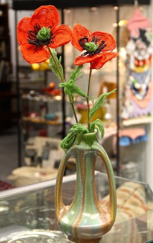 Pair of Beaded Poppy Flowers $36, Art Pottery Vase $40 ~ Dealer 422