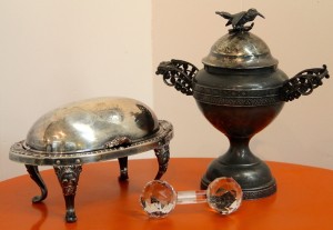 Gorgeous Silver Plate Serving Pieces and Cut Glass Knife Rest – Footed Serving Fish $28, Sugar with Bird Finial (SOLD) ~ Dealer 97