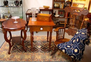 Antique Cherry One-Drawer Stand, ca. 1840 $195, Antique Blue & White Coverlet (SOLD) ~ Dealer 22