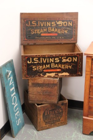 Vintage Antiques Sign (SOLD), Antique Advertising Crates $35 – $85 each ~ Dealer 362