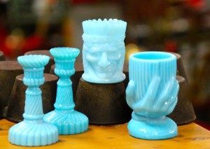 Blue Opaque Milk Glass Mini-Candle Sticks $25, Blue Opaque Indian Head Toothpick Holder $22, Hand & Cup Toothpick Holder $18 ~ Dealer 599