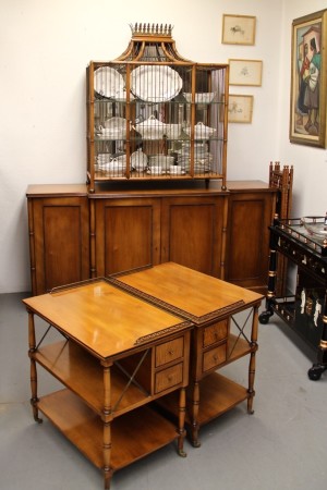 Cherry Credenza with Brass & Glass Fittings, Attributed to Kittinger, ca. 1965-75 (SOLD), Pair of Superbly Detailed Side Tables by Kittinger – Satinwood Veneers and Solid Brass Gallery Trim (SOLD)