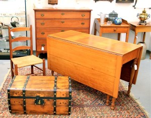 Sheraton Period Dropleaf Cherry Table with Gateleg c. 1820-20 (SOLD); Ladder Back Chair $65; Antique Pine and Iron Flat Top Trunk (SOLD) ~ Dealer 22