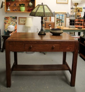 Mission Oak Desk, circa 1920s (SOLD); Antique Slag Glass Table Lamp $245; Mid-Century Bitossi Italy Pottery $45 ~ Dealer 22