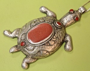 Tibetan Protection Amulet Turtle ~ Silver Repossé with Sandstone and Natural Coral (SOLD)