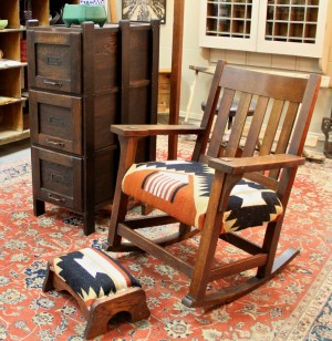 Antique Mission Rocker and Ottoman with Wool Rug Upholstery & Antique Weis Mission Three-Drawer File Cabinet (SOLD)