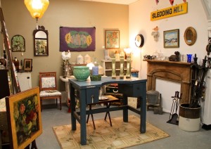 Industrial Workbench or Potting Table, Two-Sided Hand-Painted SLEDDING HILL Sign & McCoy Jardinere (SOLD)