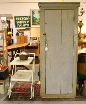 200 Year Old Gray Painted One-Door Cupboard with Rosehead Nails (SOLD); Mid-Century Folding Patio Food Cart (SOLD)