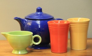 Vintage Fiestaware – Small Cobalt Teapot $125; Water Tumblers Orange $65 Yellow $68; Chartreuse Creamer $35