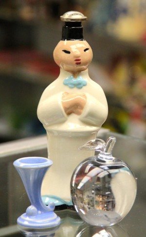 Teeny Shawnee Cornucopia (SOLD), Vintage Laundry Sprinkler (SOLD) Crystal Apple (SOLD)