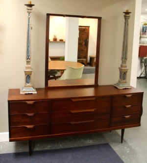 Mid-Century House of Modern Nine Drawer Dresser & Mirror (SOLD); Retro Carved Mod Candlesticks $245 ~ Dealer 77