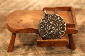 Miniature Cobbler’s Bench $30; Antique Tibetan Brass Shiva Calendar Pendant $23 ~ Dealer 27