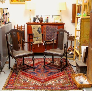 Fabulous Persian Wool Handwoven Iranian Carpet (5’2″ x 6’11”) $550; Pair of Arm Chairs with Leather Seats (SOLD) ~ Dealer 9