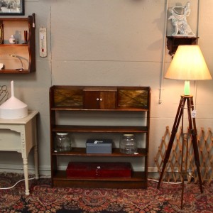 Arts & Crafts Oak Bookcase with Stained Glass (SOLD); 1920s U.S. Army Tripod Lamp with Jadeite Glass $175 ~ Dealer 15