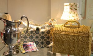 Vintage Silver Plate Pitcher (SOLD); Four Vintage Cloth Napkins $10; Tote Bag Made from Vintage Fabric $30; Wicker Handbag $20 ~ Dealer 1229