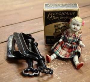 Antique Ornamental “C” Clamps $25, Small Bisque Doll (SOLD), Bergham Ice Skate Sharpener $8 ~ Dealer 362