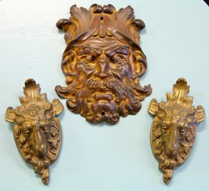 Bronze Face with Glass Eyes (SOLD); Pair of Bronze Ram Heads $85 ~ Dealer 45