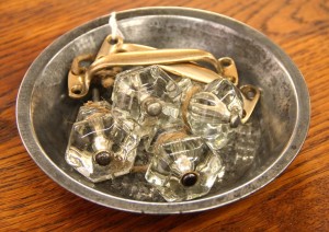 Set of Four Medium Glass Knobs $39; Pr of Brass Handles $19; Individual Tin Pie Tin with Embossed Design $11 ~ Dealer 13