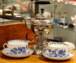 Two Meissen Cups and Saucers $40 (Dealer 10), Teapot on Stand with Warmer, ca. 1897 $39 (Dealer 43)